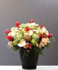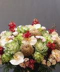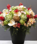 This elegant floral arrangement features Peach Cremon roses, delicate apricot-cut orchid blossoms, fresh brassica, and charming Reflex baby roses, thoughtfully arranged in a sleek black pot. Designed to bring a sophisticated touch to any space, the combination of textures and soft, warm hues creates a balanced and inviting display, ideal for enhancing modern interiors or as a refined gift choice.